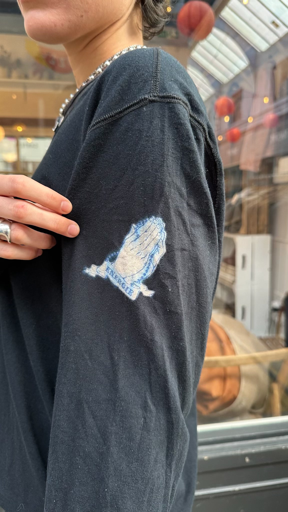 Long sleeve black round neck cotton top with prayer hands logo on right shoulder