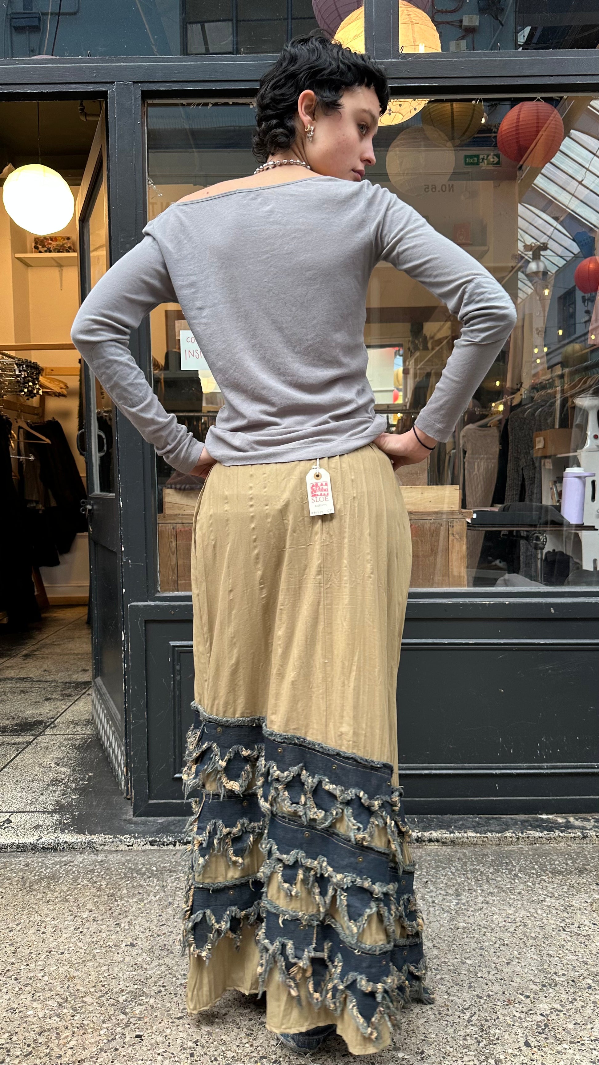 Beige khaki and denim maxi skirt with distressed denim hem, such a unique and beautiful piece