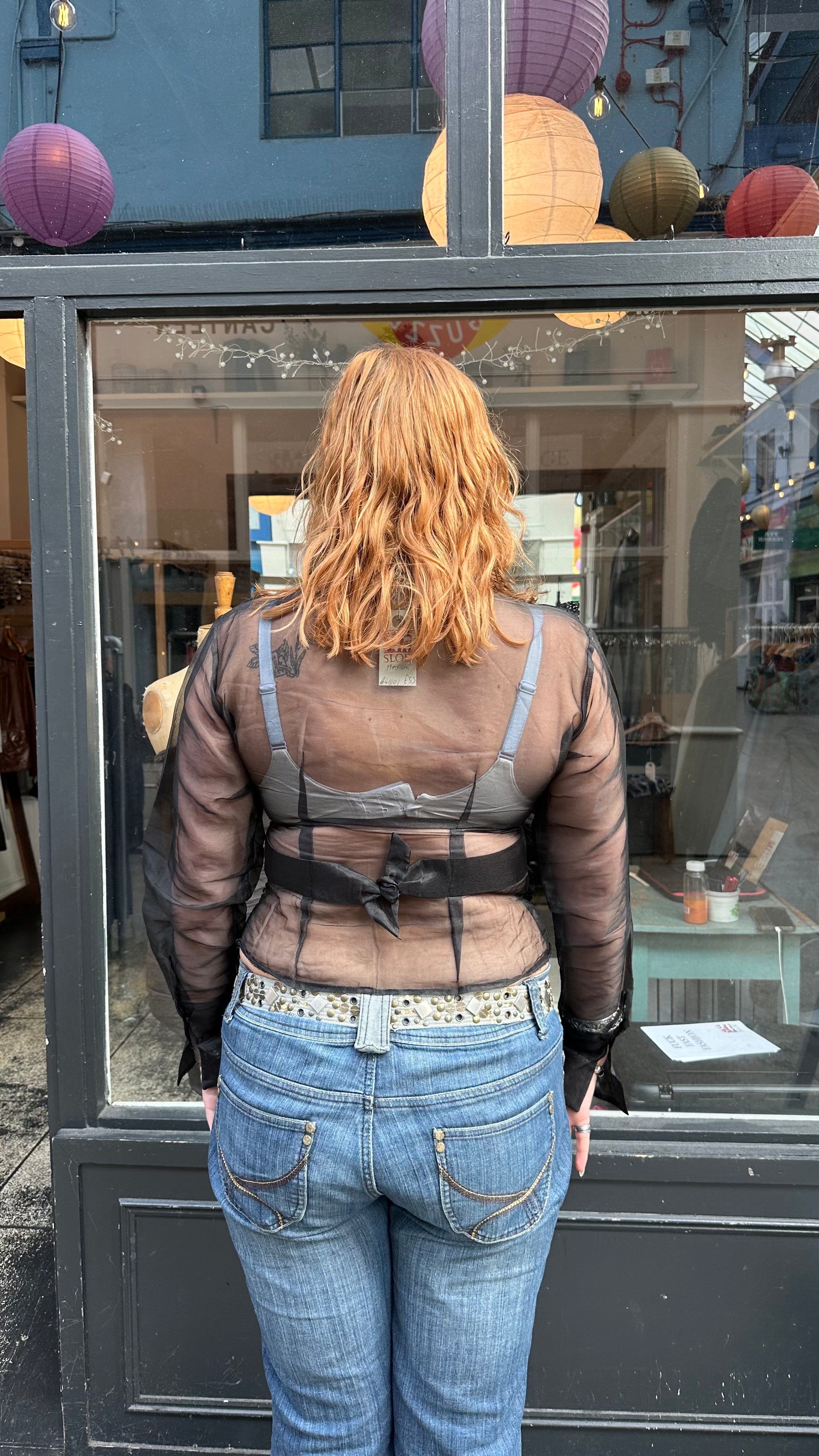 Sheer slightly cropped blouse with rouched front panel a great layering piece