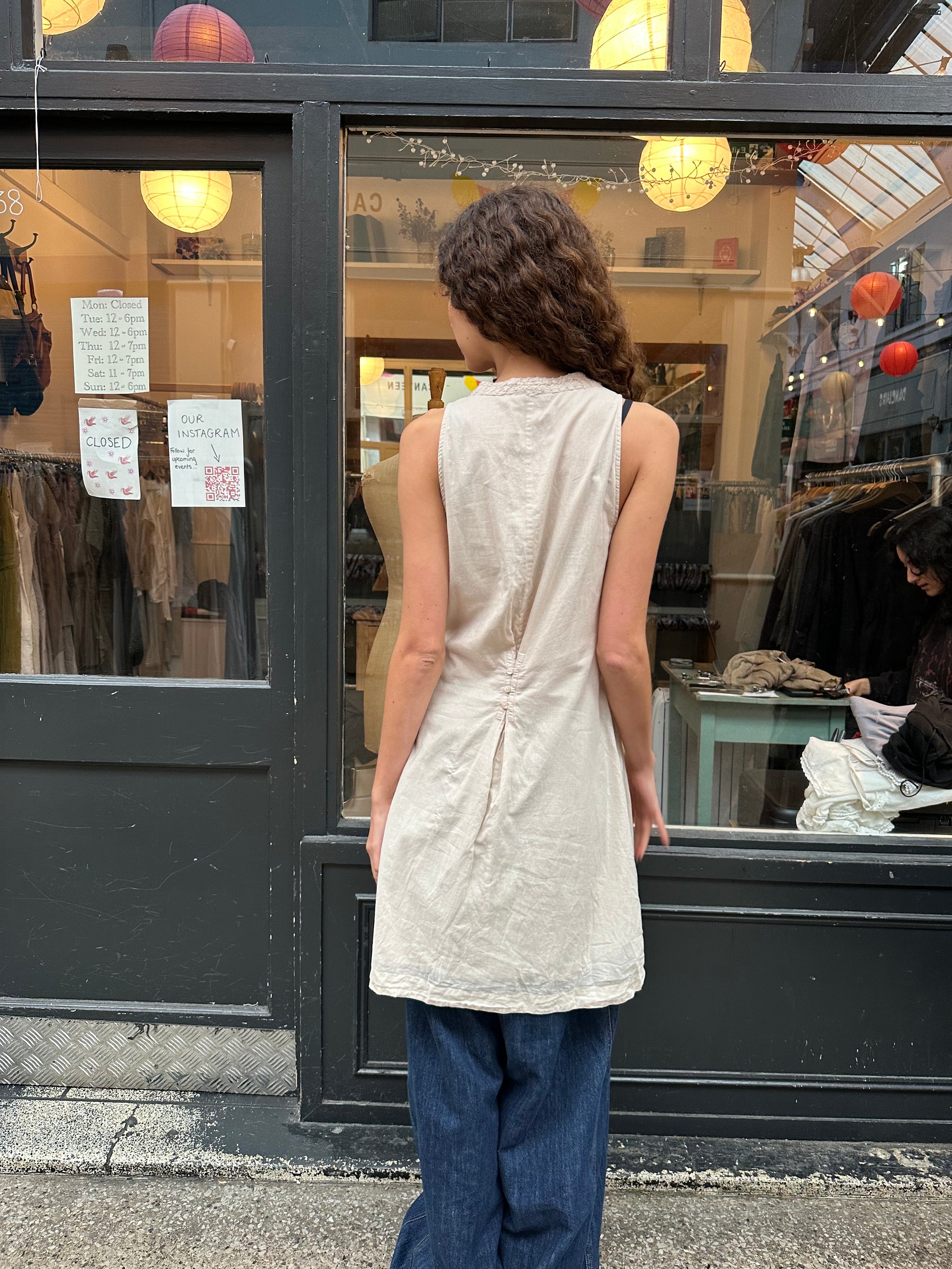 The most beautiful cream/pale pink sleeveless cotton dress, such stunning button details on the sides and the back.