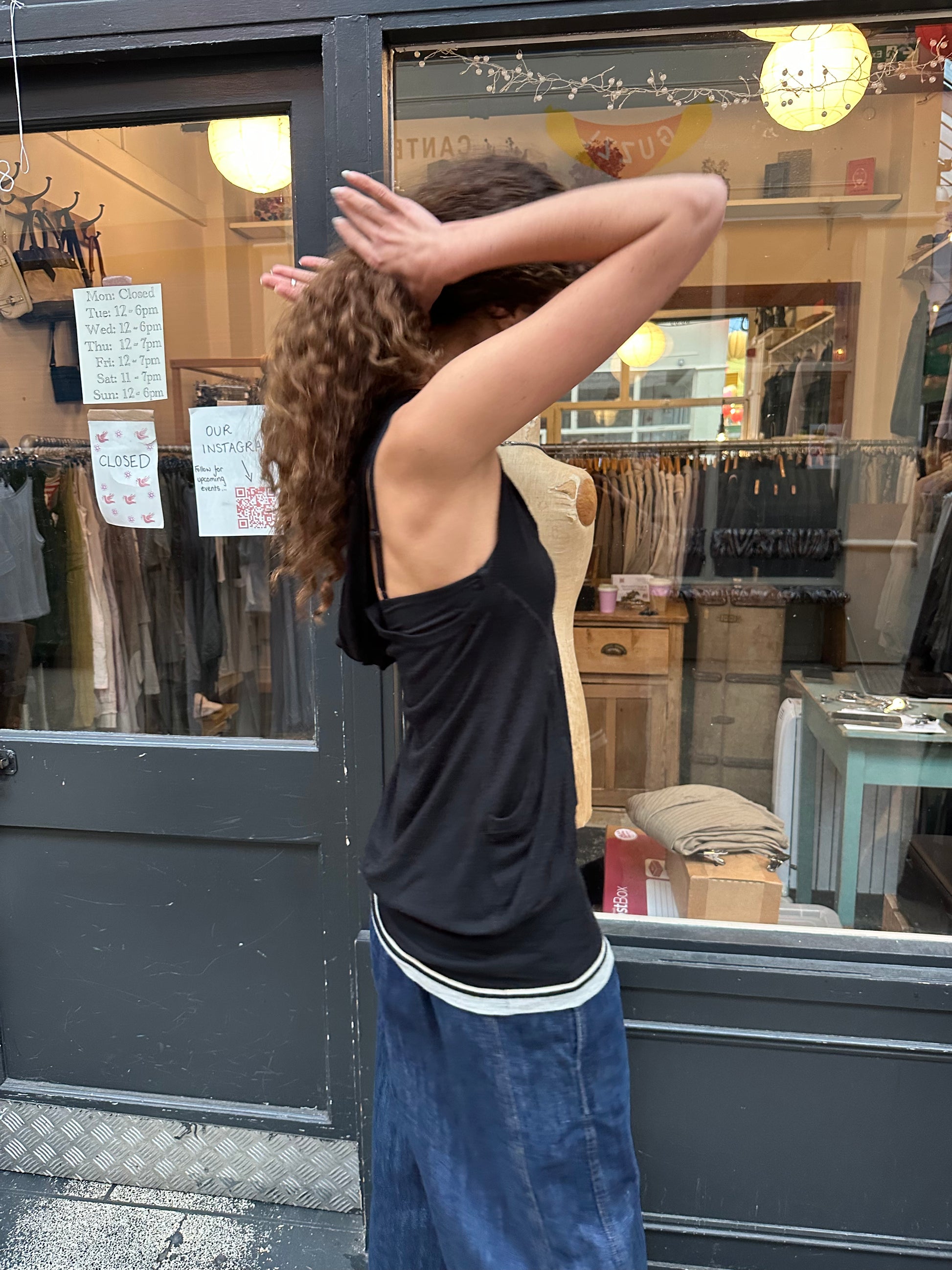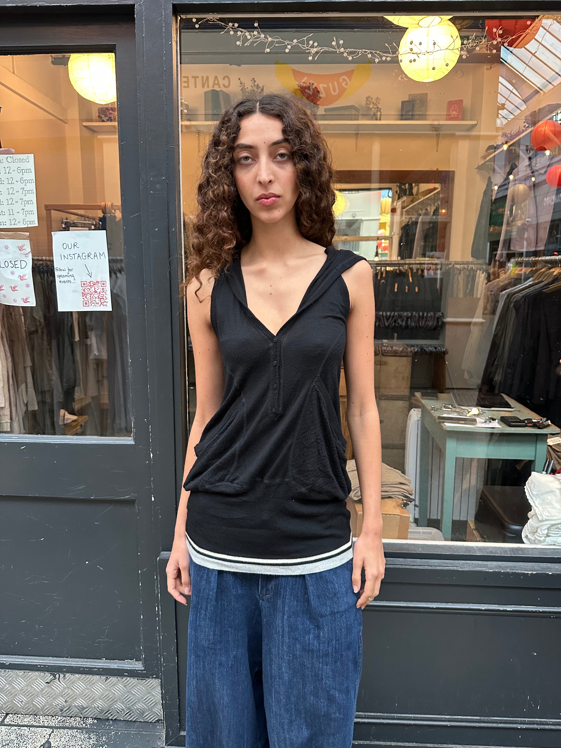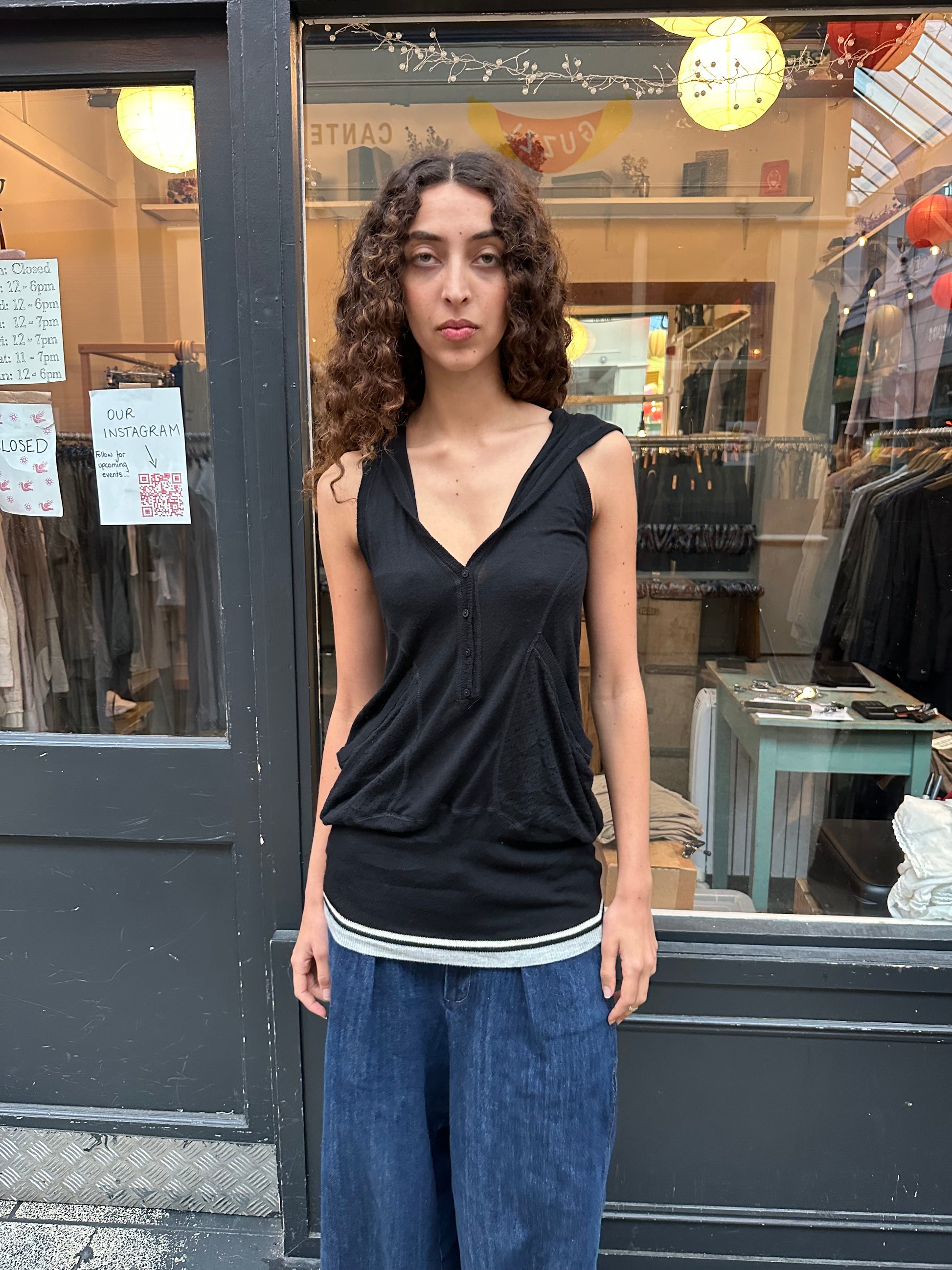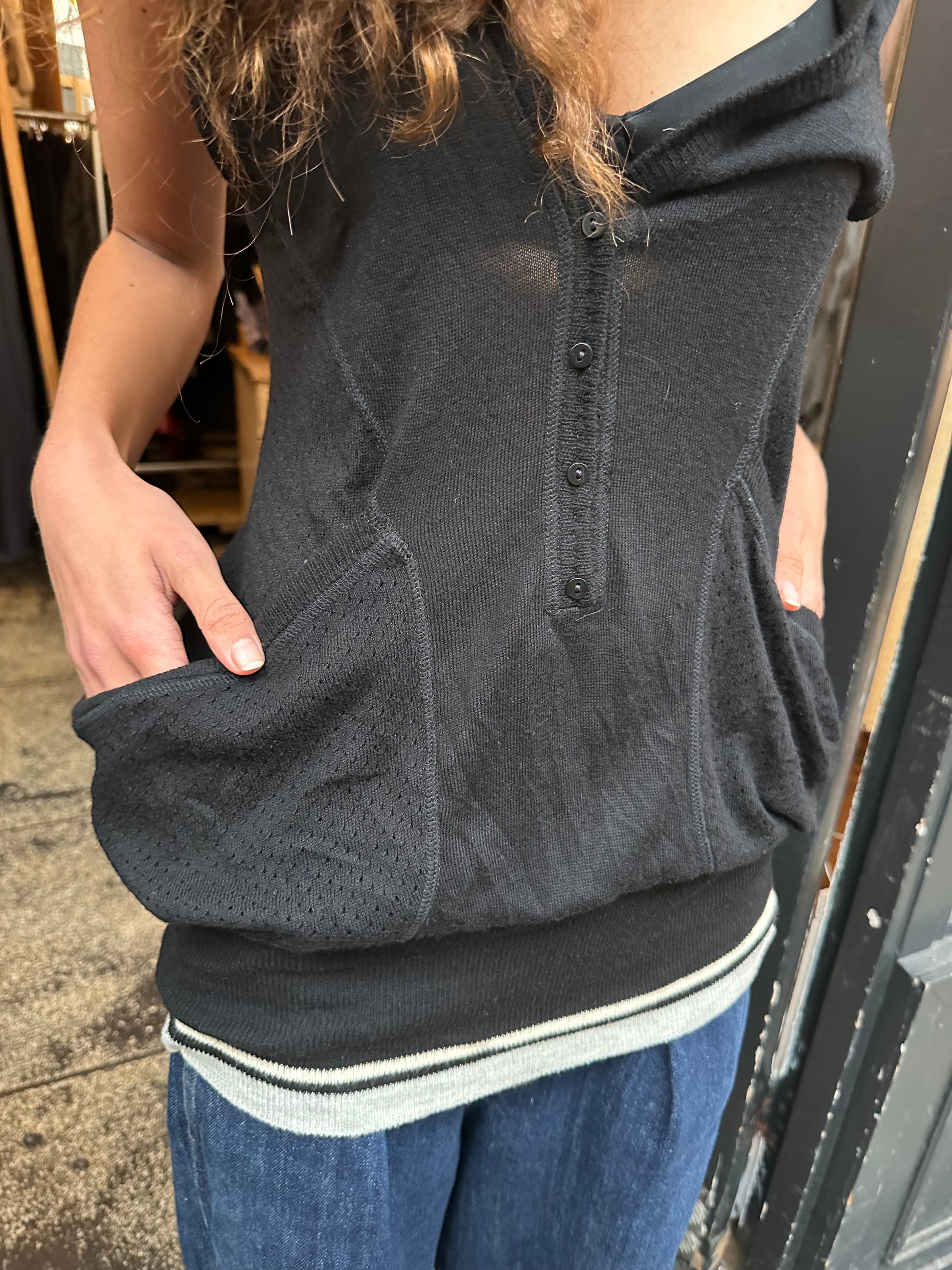 Super unique black soft knit hooded sleeveless dress with draped pockets, in such a lovely soft material.