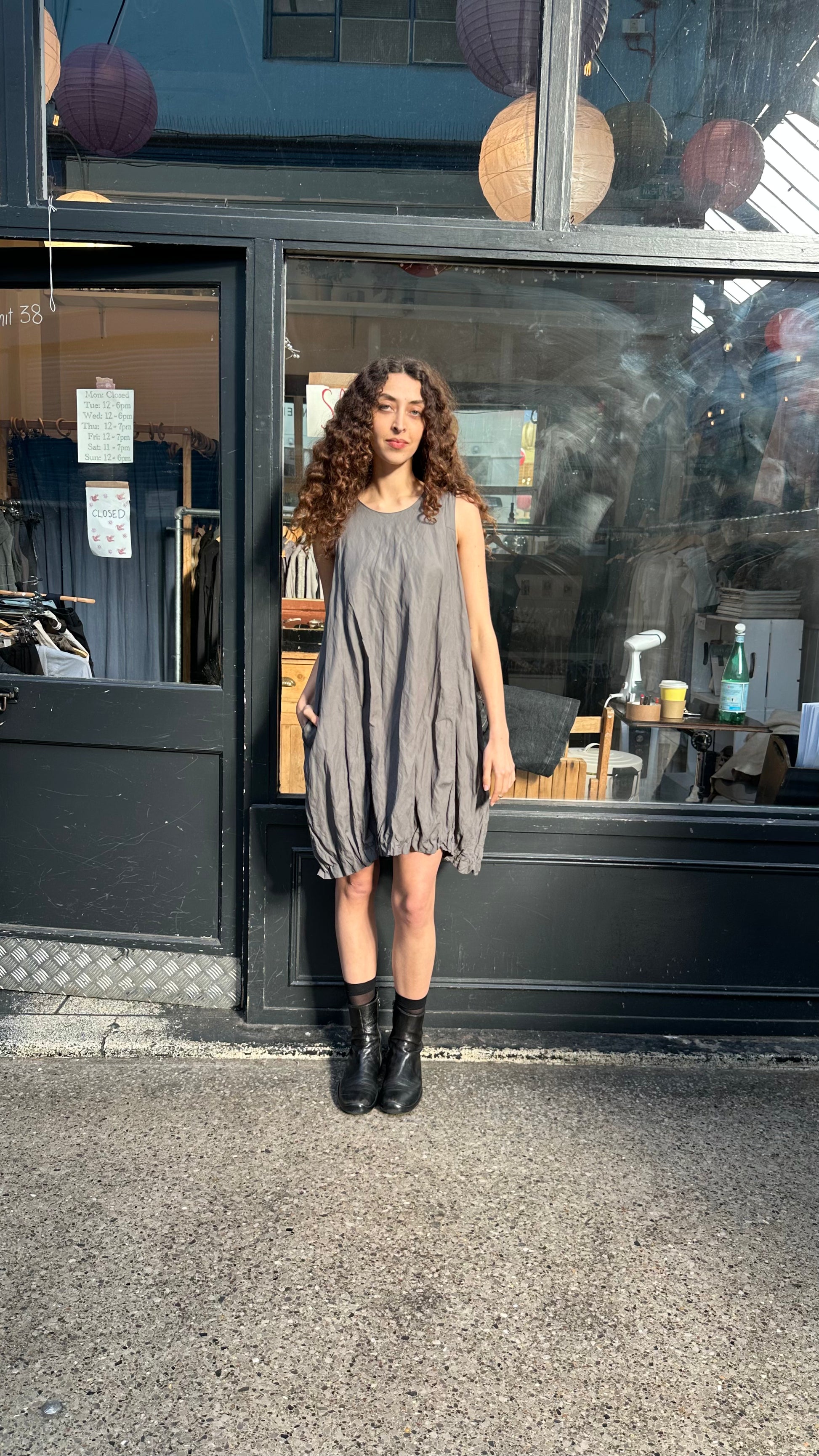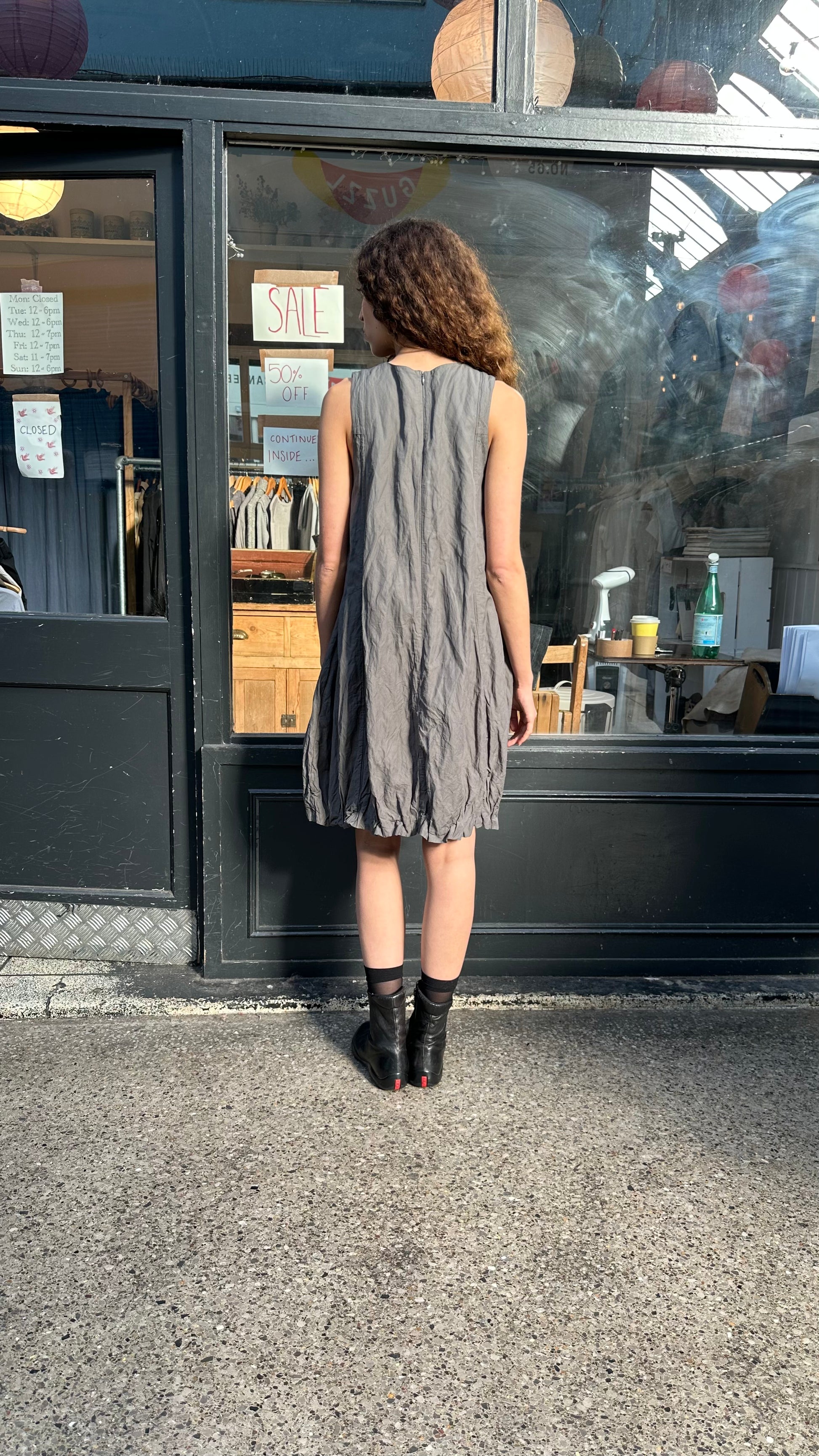 Amazing structured shift dress by 'Sarah Pacini'. Ruched hem creates bubble silhouette. Great layering piece.