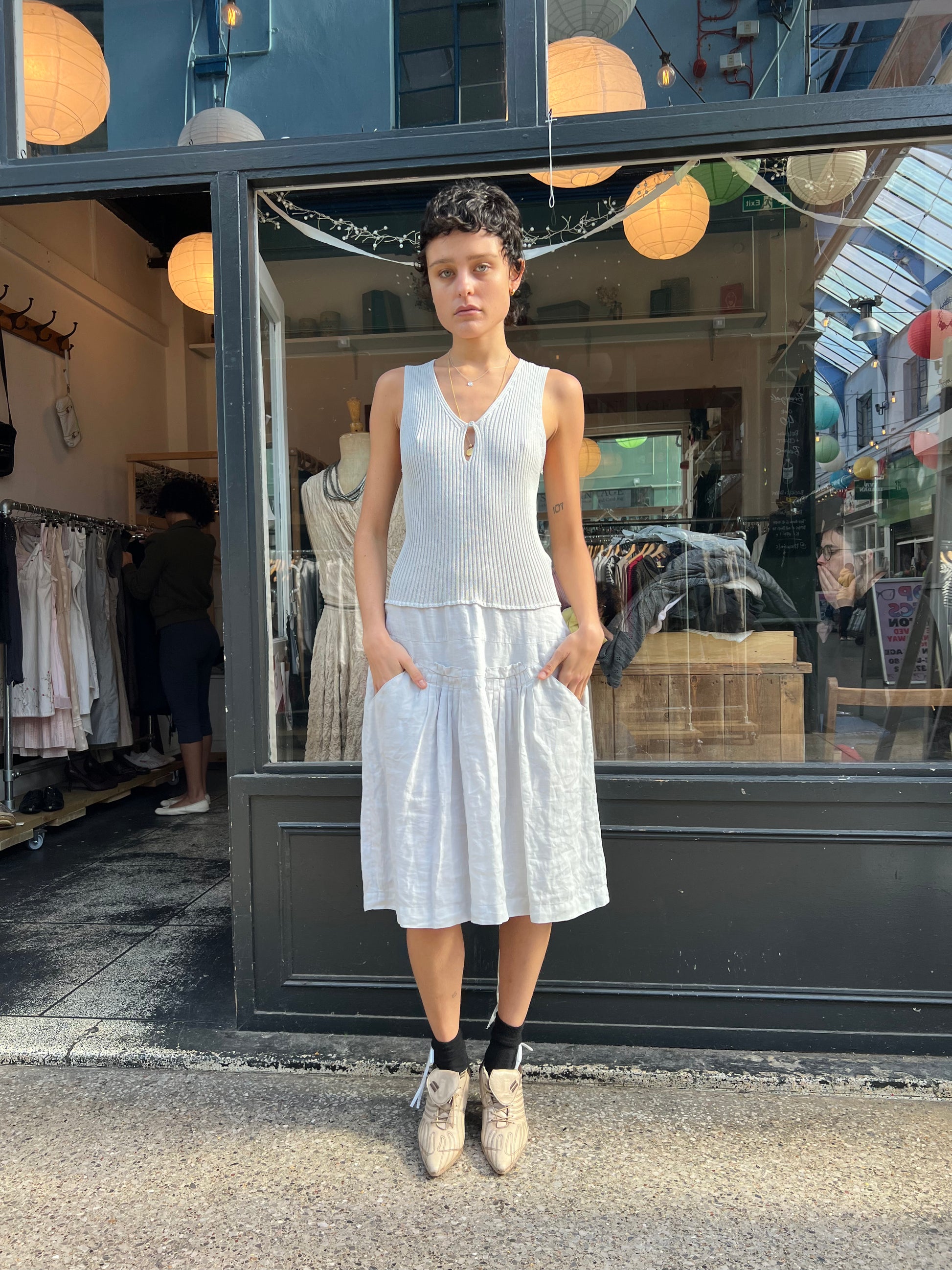 Super pretty pale grey sleeveless dress with ribbed upper and linen lower sections. Can be dressed up or down, such a lovely piece.